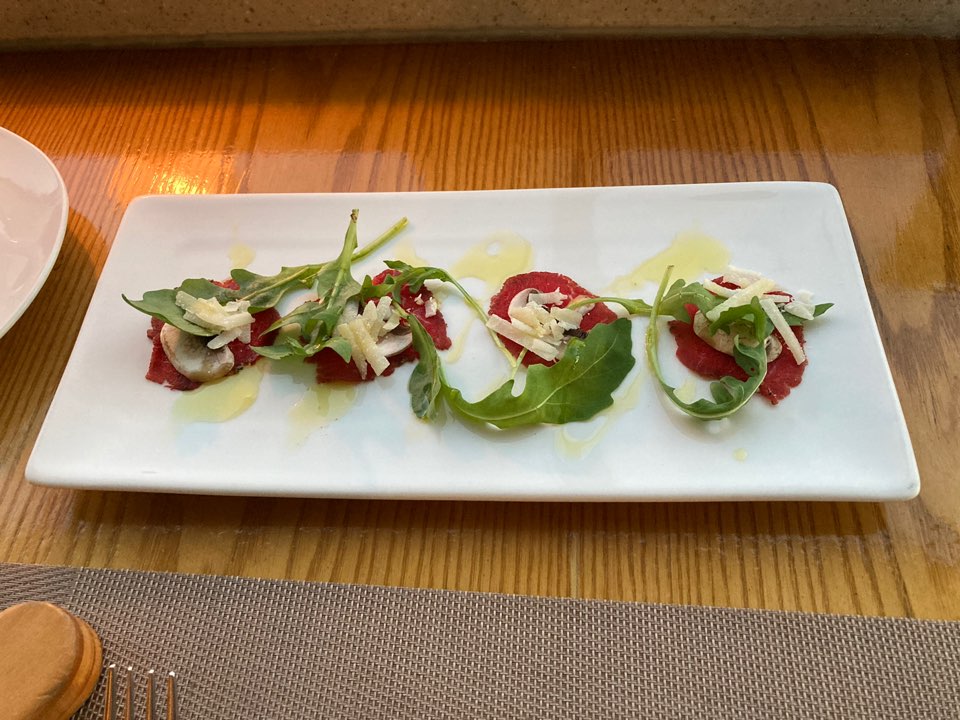 한우 카르파치오의 저 초록색 채소가 향이 참 좋아서 맛있게 먹었습니다.